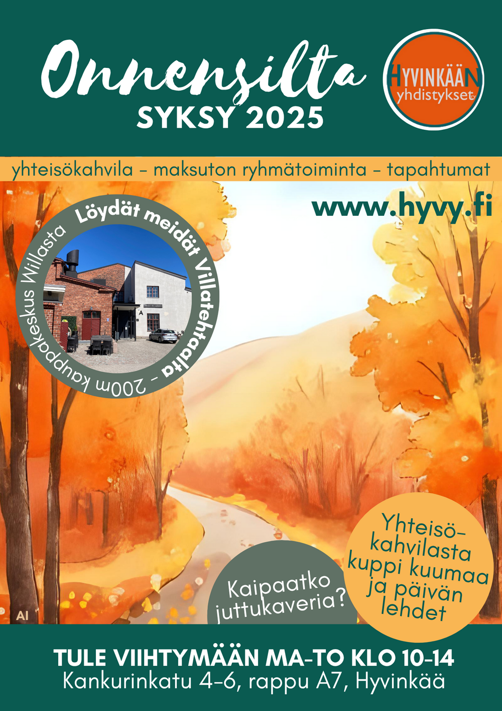 Hyvinkään Yhdistykset ry is a network organization that maintains a meeting place called Onnensilta. It also enables voluntary activities. We communicate, influence, and invite people to our common tables.
