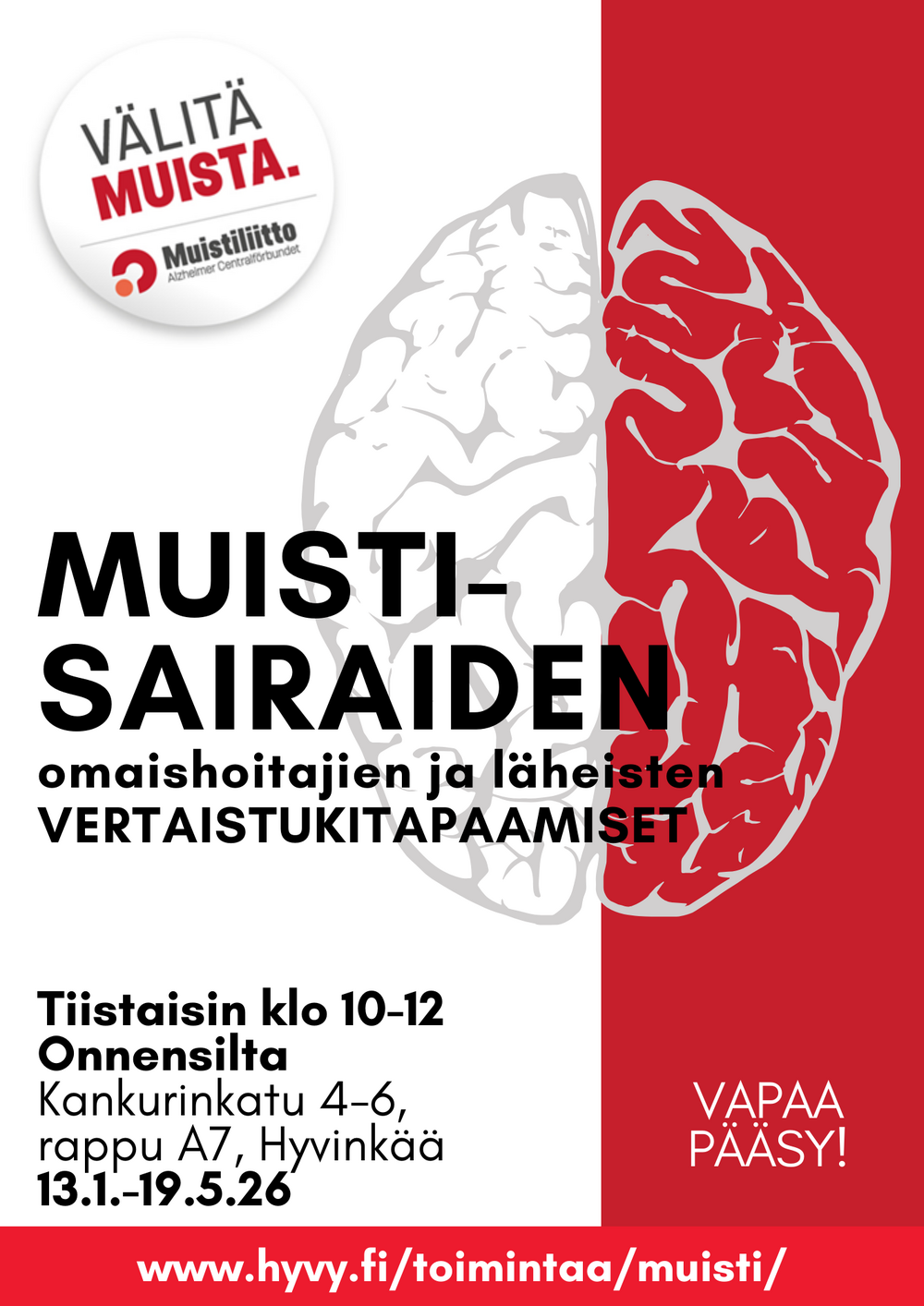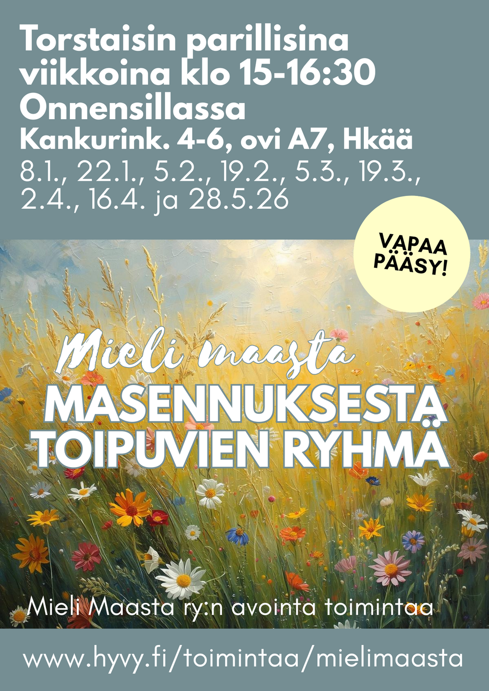Vertaistuesta voimaa! Ryhmään voit tulla omana itsenäsi. Emme kysele diagnooseja. Tuemme toinen toistamme. Kokoontumiset parillisina viikkoina klo 15-16:30, Onnensillassa. Kevätkausi 2026: 8.1.,…