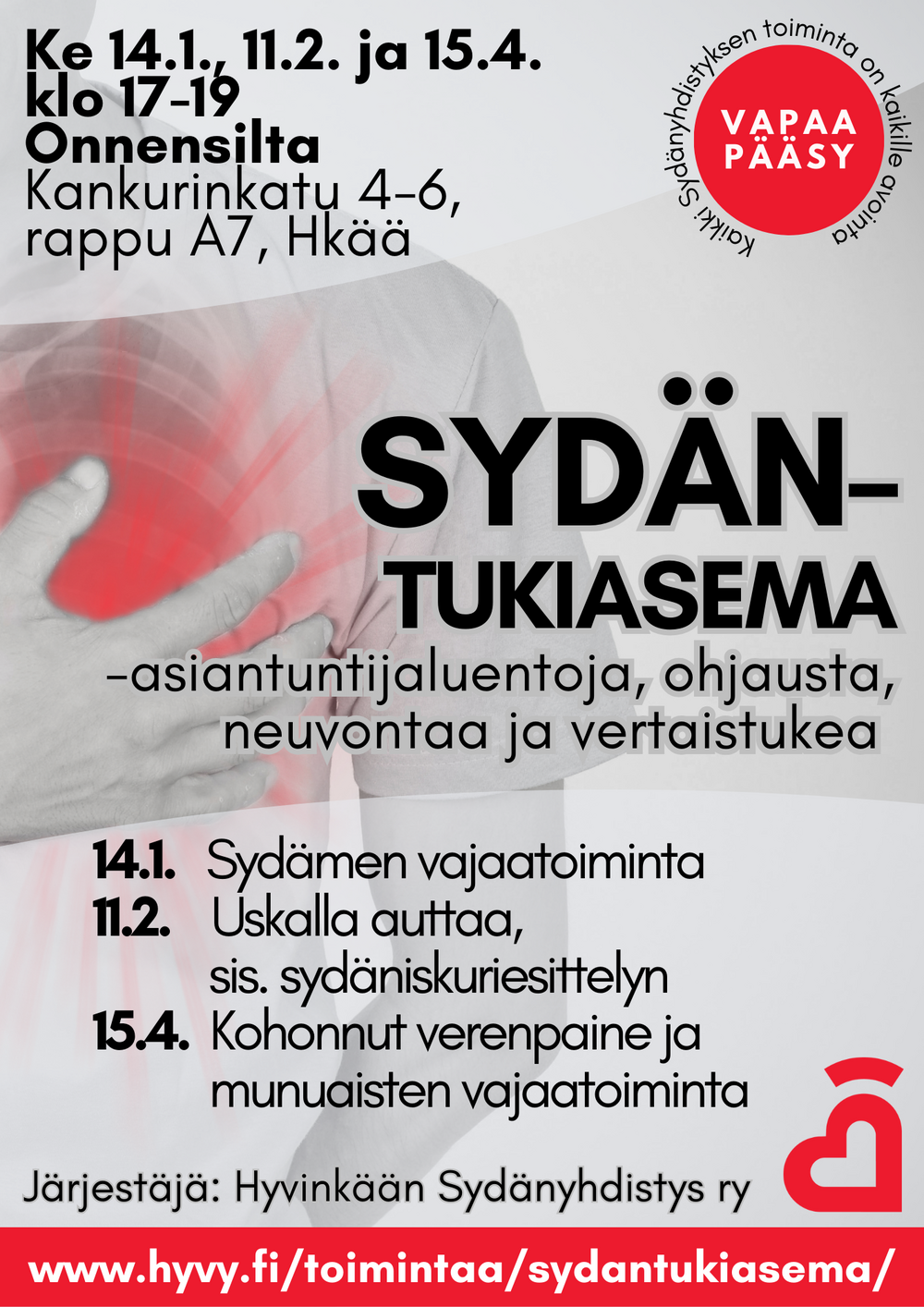 Kaikille avointa toimintaa! Sydäntukiasemassa sydänterveyden edistämistä, elintapaohjausta ja voimavarojen vahvistamista tavoitteena hyvä elämä sairaudesta huolimatta. Tarkempi ohjelma julkaistaan…
