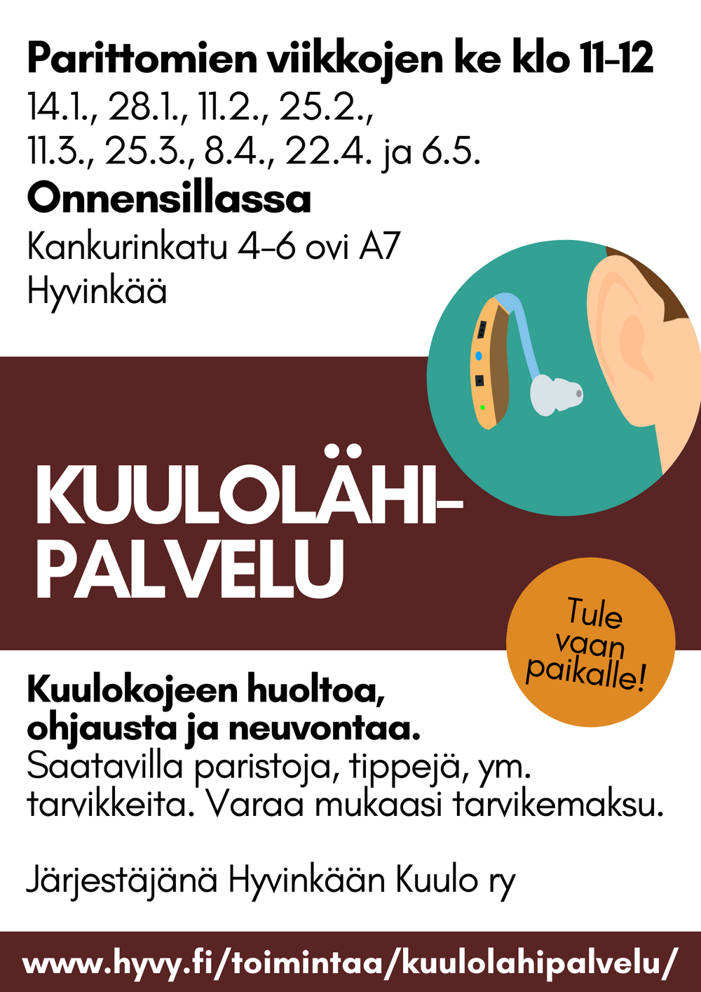 Kuulokojeen kanssa pulmia? Apua on lähellä! Hyvinkään Kuulo ry:n vapaaehtoiset auttavat sinua kuulokojeen huollossa, ohjauksessa ja neuvonnassa. Meiltä saat: - Apua kuulokojeen huoltoon - Ohjausta ja…