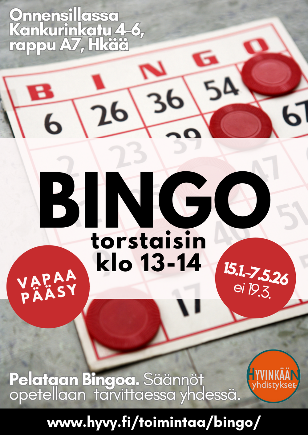 Unohda hetkeksi arjen kiireet ja tule viettämään hauska tunti kanssamme. Luvassa on rentoa yhdessäoloa, kuin myös jännittäviä hetkiä bingon parissa. Missä? Onnensillassa, Kankurinkatu 4-6, rappu A7…
