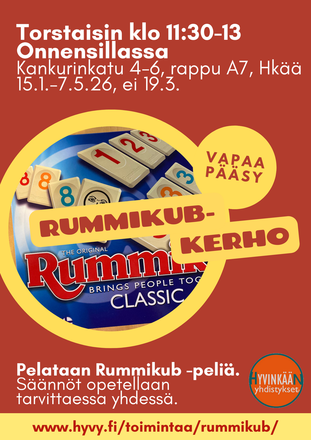 Tule pelaamaan Rummikub -peliä yhdessä Onnensiltaan! Rummikub on 'lautapeli', jota pelataan numerolaatoilla. Pelaajat yrittävät muodostaa kädessään olevista laatoista erilaisia yhdistelmiä,…