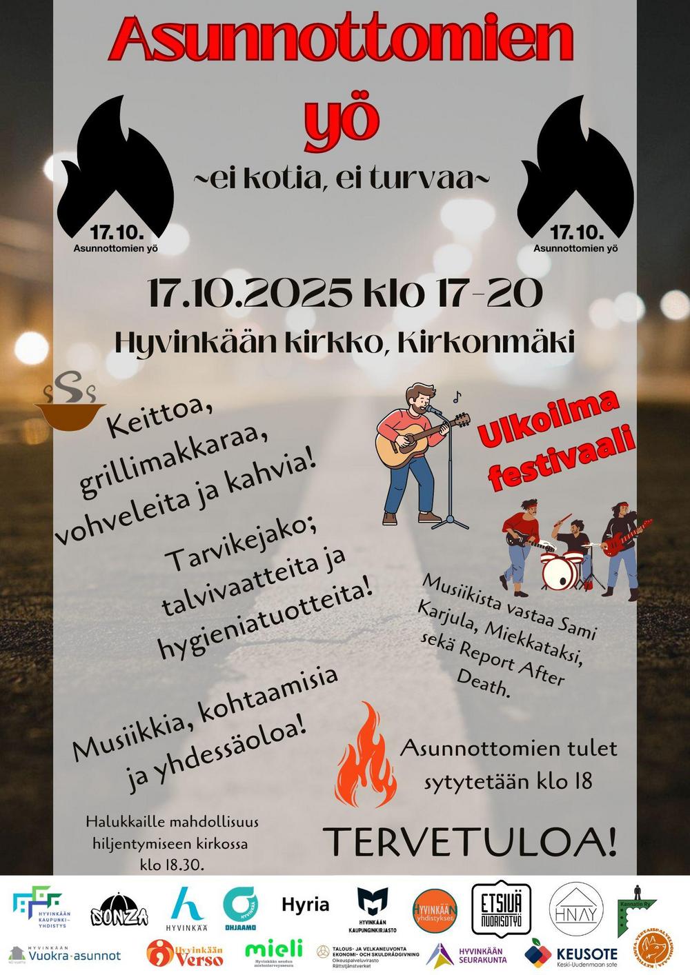 Asunnottomien yötä vietetään jälleen 17. lokakuuta YK:n köyhyyden ja syrjäytymisen vastaisena päivänä Helsingissä ja eri puolilla Suomea, myös Hyvinkäällä. Vuoden 2025 teemana on: ”Ei kotia, ei turvaa”.