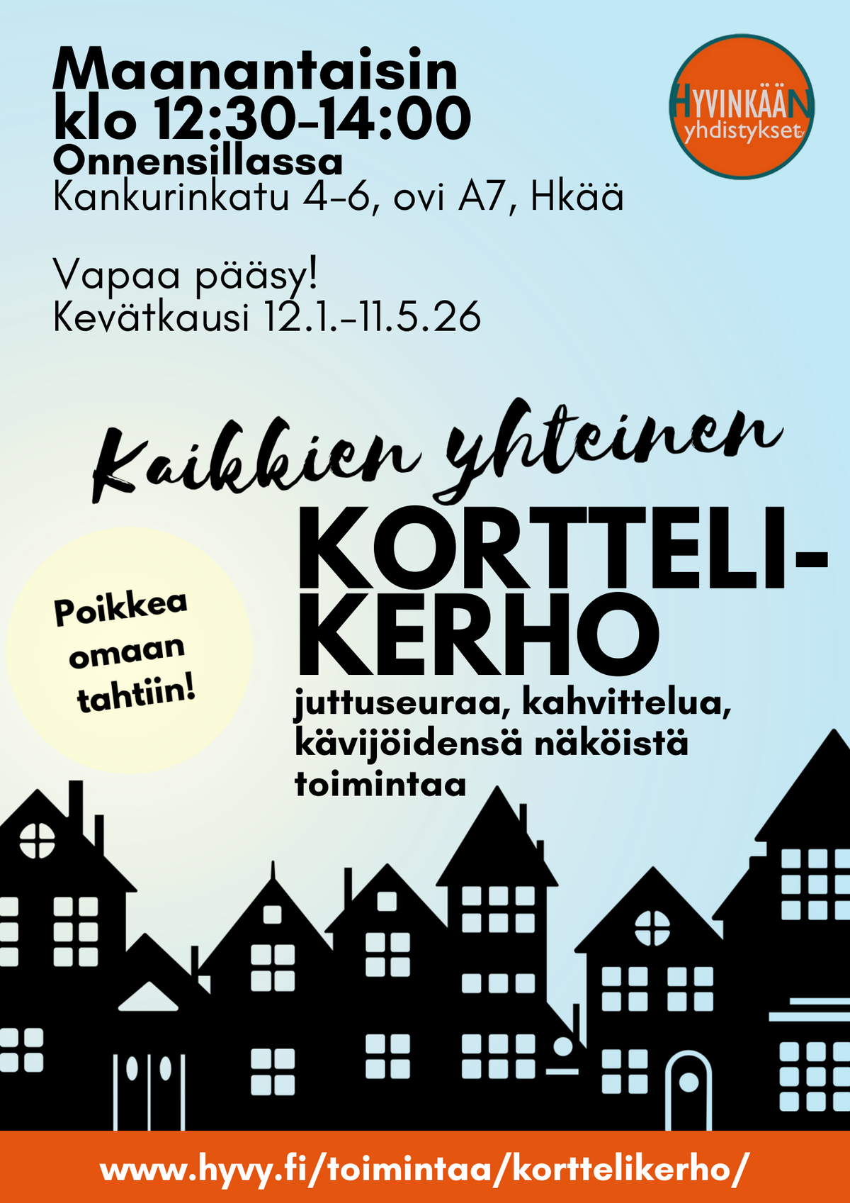 Tule mukaan Kaikkien yhteiseen Korttelikerhoon! Meillä voit piipahtaa silloin, kun sinulle sopii, ja nauttia mukavasta yhdessäolosta.