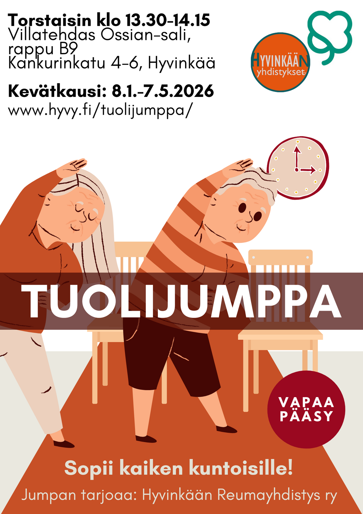 Tule mukaan rentoon ja ilmaiseen tuolijumppaan! Unohda hikiset treenit ja monimutkaiset liikkeet – meillä jumppaillaan rennosti istuen, mutta silti tehokkaasti. Tuolijumppa sopii kaikille, iästä ja kunnosta riippumatta.