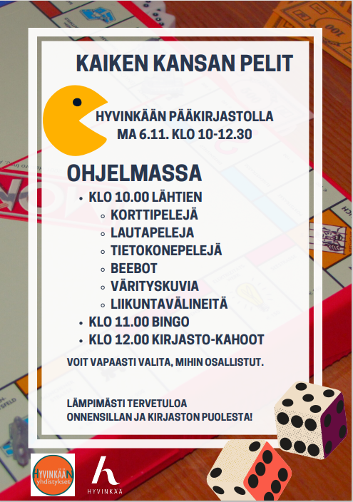 Tervetuloa pelaamaan ja tutustumaan erilaisiin peleihin valtakunnallisen peliviikon kunniaksi! Pelien täyteistä aamupäivää vietetään ma 6.11.23 klo 10-12.30 pääkirjastolla.